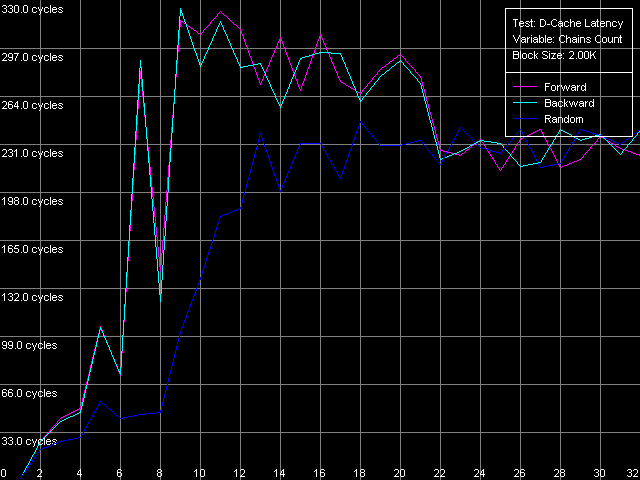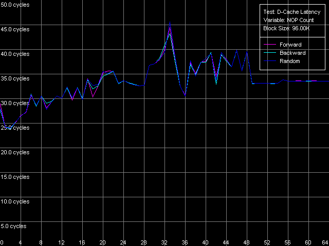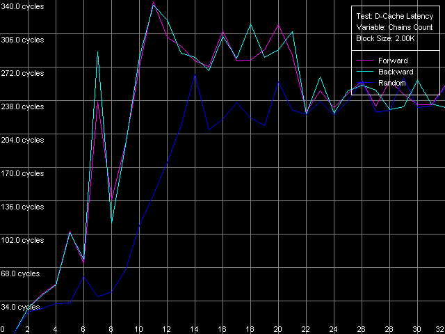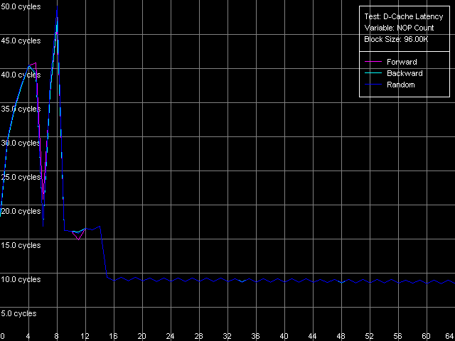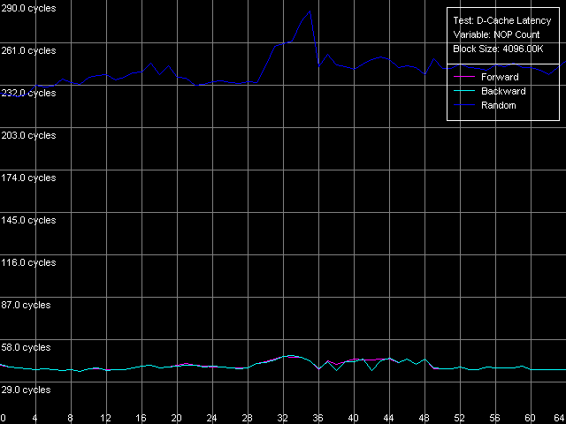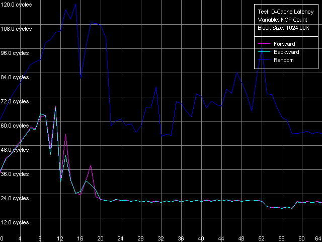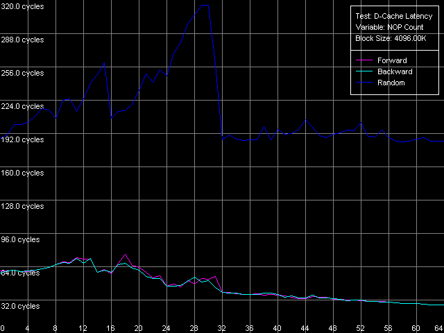 И снова Northwood и Gallatin ведут себя вполне адекватно. Минимальная латентность L2 — 9 тактов, как и положено, и наблюдается она при вставке 18 «NOP»-ов (что в точности соответствует 9 тактам процессора, как и положено в данной методике тестирования). Картина на Prescott, хотя и не принципиально, но иная. Минимум составляет 22 такта, и наблюдается он при 22 «NOP»-ах (а поскольку каждый из них отнимает 1 такт процессора, значит, 22 такта и получается). Так и запишем — минимальная латентность L2 у Prescott — 22 такта, и ничего больше не скажешь.