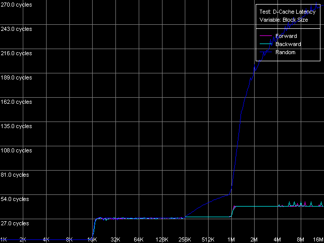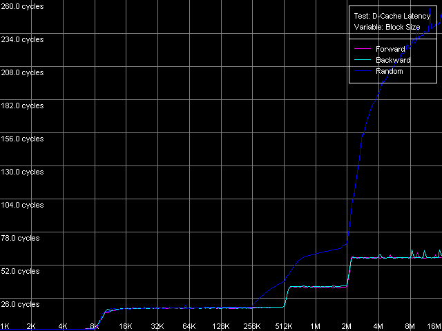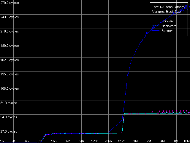 Как видно из этой таблицы, серьезных различий между Northwood и Gallatin в плане латентности не наблюдается. Латентность L1 во всех случаях доступа составляет ровно 2 такта, латентность L2 — в среднем 18.5 тактов. Латентность кэша L3 процессора Pentium 4 XE при прямом и обратном доступе почти в два раза выше, чем латентность L2 — она составляет 35.5 тактов (а при случайном доступе — и того выше, 61 такт процессора, правда, с упомянутой выше оговоркой, что точное измерение последней не представляется возможным ввиду исчерпания D-TLB процессора). Наконец, латентность последнего уровня — оперативной памяти — характеризуется величинами 57-58 тактов (17.6-18.0 нс) при прямом/обратном доступе, что говорит о наличии хорошего алгоритма Hardware Prefetch, работающего в этих режимах обхода. Латентность случайного доступа в RAM (с той же оговоркой) существенно выше, она составляет 229 тактов (71.0 нс) на Northwood и 185 тактов (57.0 нс) на Gallatin. Меньшую величину латентности памяти на последнем можно отнести разве что к наличию кэша данных третьего уровня, объем которого позволяет покрыть до 50% обращений к памяти в рассматриваемом случае.