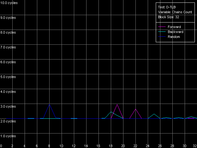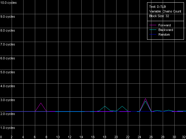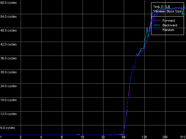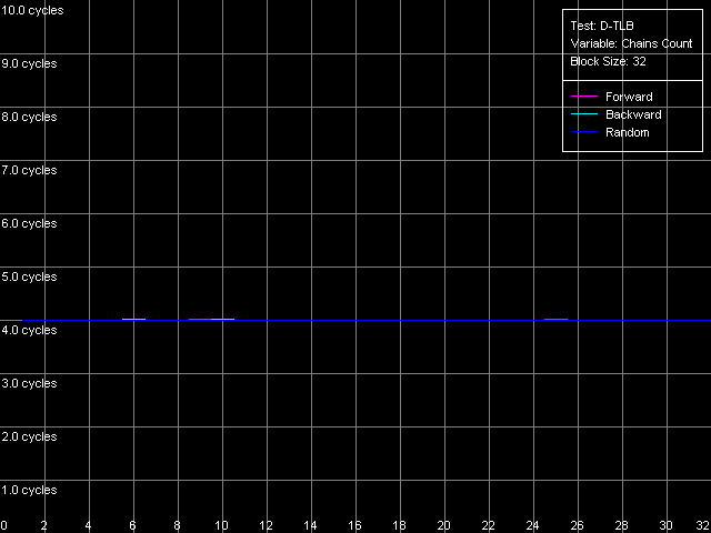 О D-TLB мы уже говорили довольно много, настало время наконец исследовать его характеристики специализированным тестом (D-TLB). Для начала оценим его размер, который, согласно неоднократно сделанным выводам, должен составлять всего 64 записи. Используем с этой целью пресет D-TLB Size.