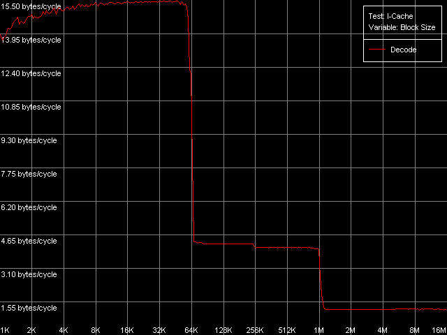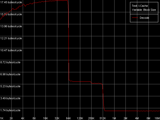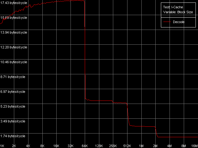 Легко заметить, что объем Trace Cache во всех случаях, в пересчете на количество микроопераций, реально не превышает величину 11000 uop, что позволяет предположить наличие некоторого резерва в одну тысячу микроопераций, отводящегося под служебные нужды. Максимальная скорость исполнения простых команд из Trace Cache достигает 2.9 операций/такт. При этом видно, что она лимитируется именно исполнительным блоком процессора (предельная скорость работы которого — 3 микрооперации/такт), а не скоростью «подкачки» инструкций из Trace Cache, в пересчете на размер x86 команд (скорость исполнения достигает 17.44 байт/такт и выше). По этому показателю процессоры семейства Pentium 4 выгодно отличаются от рассмотренных нами ранее AMD K7/K8, где скорость исполнения больших x86 команд лимитировалась именно скоростью «подкачки» инструкций из L1i в исполнительный блок процессора (не более 16 байт/такт).