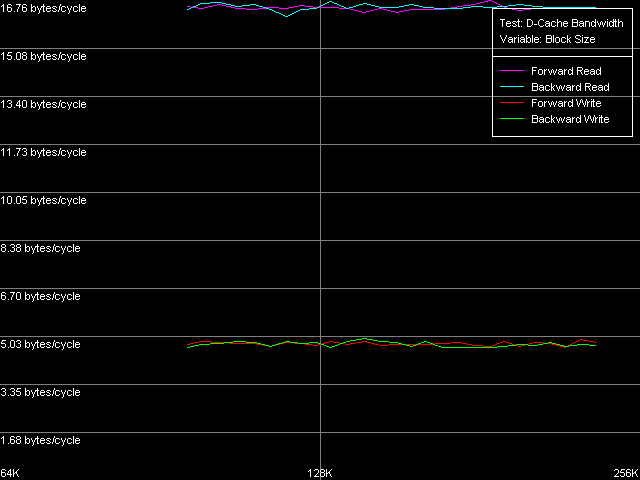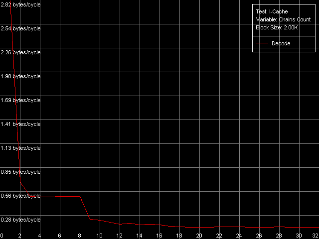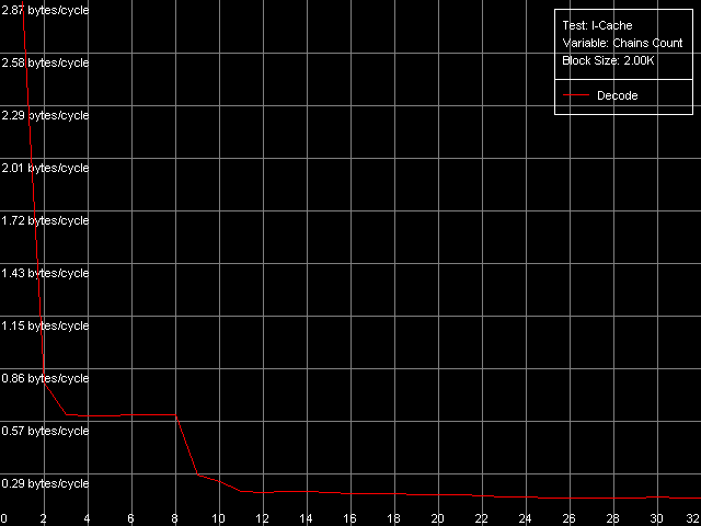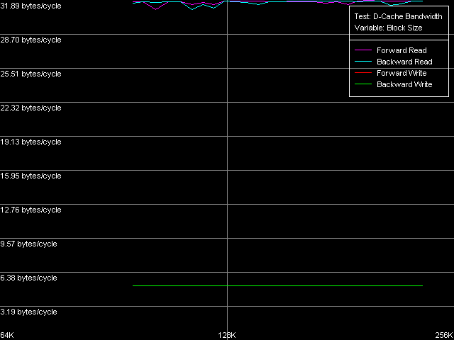 Без сюрпризов со стороны Prescott нам, конечно, не обойтись. На этот раз это обработка зависимых команд, вроде LEA/MOV/ADD/OR. Как видно из таблицы, они ведут себя одинаково и исполняются со скоростью всего-навсего 1 операция/такт (кстати, напомним, что то, что OR ведет себя именно так, мы выяснили еще в тесте минимальной латентности L2/RAM). Именно поэтому здесь мы даже не смогли оценить эффективную границу Trace Cache, ибо их скорость исполнения как из L1i, так и из L2 одинакова — 2 байта/такт.