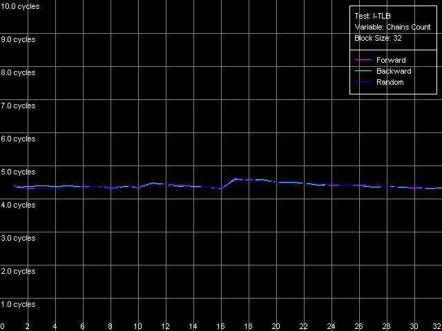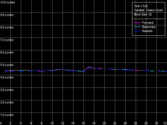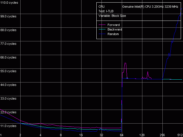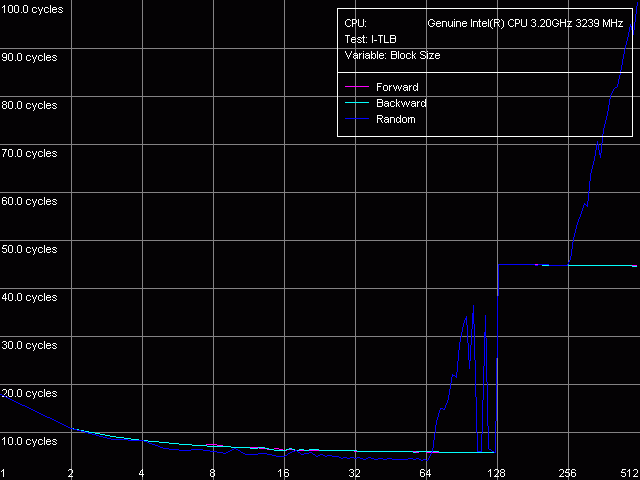 Мы решили проверить, так ли это на самом деле, для чего запустили реализованный в RMMA v2.5 тест I-TLB (пресет I-TLB Size). Результаты теста на Northwood и Prescott оказались одинаковыми — ниже мы приводим картинки, полученные на последнем.