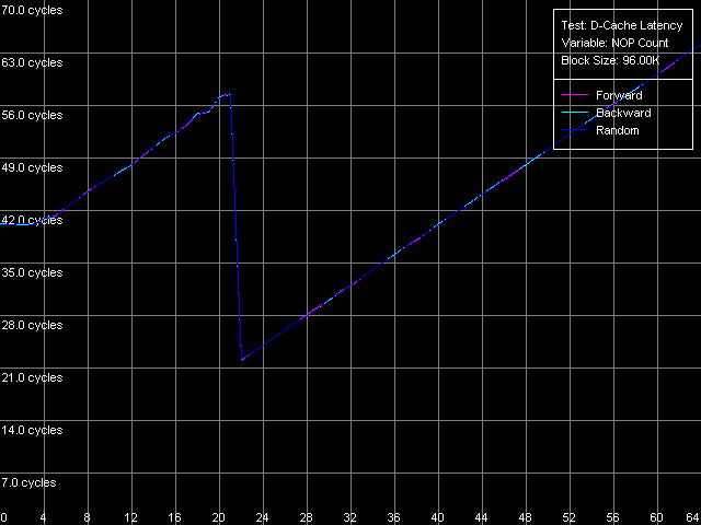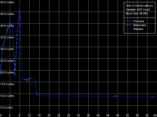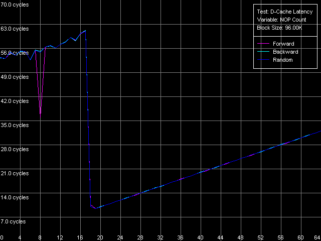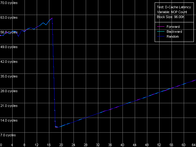 Минимальная латентность L3 при прямом и обратном последовательном доступе достигается столь же легко, уже при вставке 20 «пустых» операций, и составляет 20 тактов процессора (некоторое ее снижение до 17 тактов при вставке 53-58 «NOP»-ов остается не очень понятным). Минимальная латентность случайного доступа в L3 намного больше (причина этого уже обсуждалась выше) — в нашем тесте она составила 52.7 тактов, что все же меньше, чем ее среднее значение.
