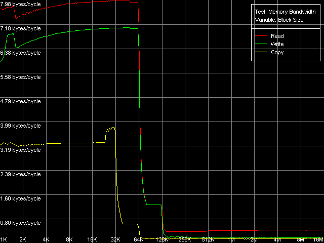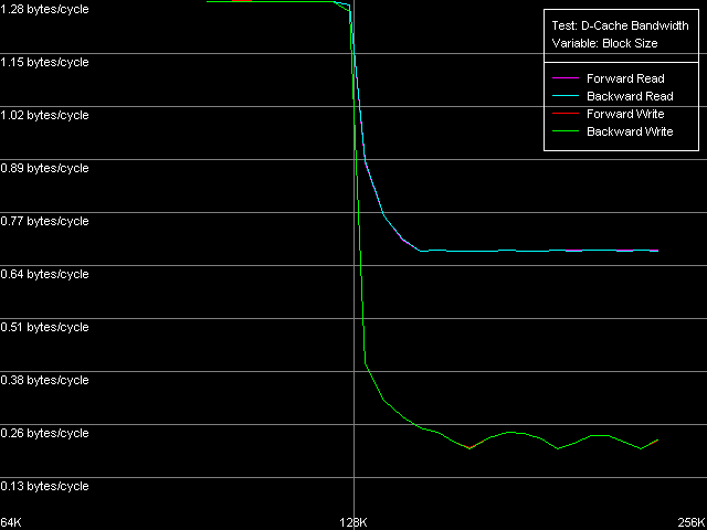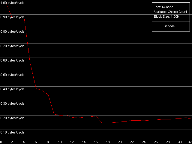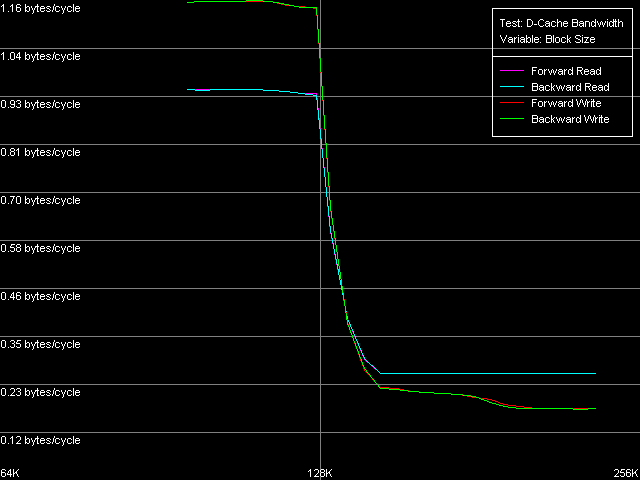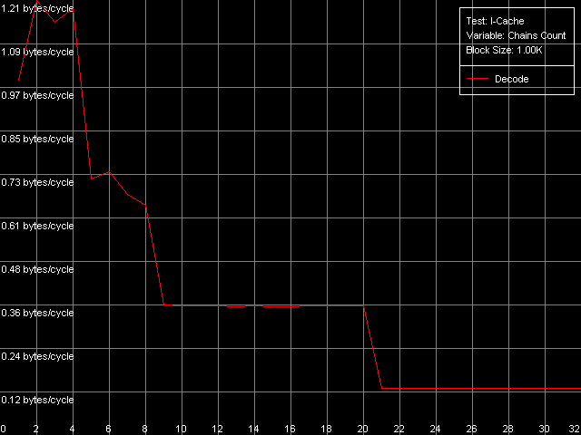 Вернемся к значениям эффективности декодирования инструкций в представленной выше таблице, и рассмотрим теперь значения в области L2 кэша. За исключением простейшей однобайтной NOP (скорость декодирования/исполнения которой ограничена конвейером процессора), эффективность декодирования инструкций из L2 составляет 1.15 байт/такт (0.58 инструкций/такт и ниже), что, очевидно, лимитируется скоростью «закачки» инструкций из L2 в L1, которая, как мы помним, осуществляется «агрессивным» скрытым образом :). Кстати, у Ezra это выглядит не столь уж иронично — действительно, 1.15 байт/такт — это куда выше, чем загрузка данных из L2 в L1, которая, как мы видели по результатам первого теста, осуществляется со скоростью 0.61 байт/такт. У Antaur картина выглядит в точности наоборот — загрузка данных (1.28 байт/такт) осуществляется быстрее «подкачки» инструкций из этого же кэша в L1i.