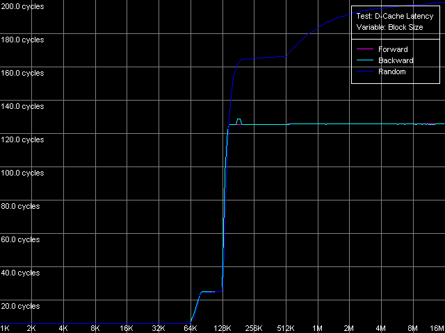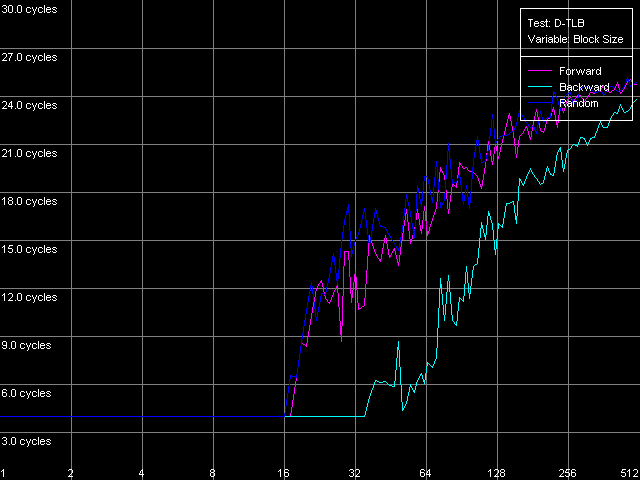 Как мы уже говорили в самом начале, размер D-TLB у обоих процессоров должен составлять 128 записей. Что и наблюдается у Antaur. Но какие красивые кривые рисует нам Ezra! По ним, в целом, можно сказать, что размер D-TLB у последнего — якобы всего 16 записей. Что еще можно сказать по данным этого теста? Главное, что промах D-TLB обходится для Antaur весьма «дорого» — латентность доступа в L1 возрастает до 34 тактов. У Ezra, если, конечно, верить такому виду кривых, промах обходится менее «дорого» — латентность L1 увеличивается до 24 тактов.