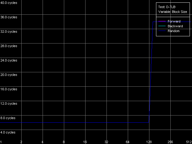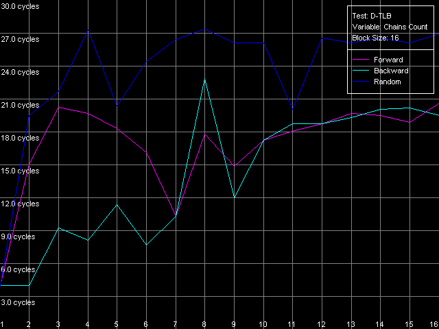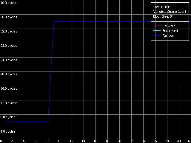Они не только совпадают одна с другой (т.е. все режимы обхода D-TLB дают одинаковые результаты), но и позволяют правильно определить ассоциативность D-TLB, которая, как и положено, оказывается равной восьми. Кроме того, промах D-TLB за счет «пробоя» его ассоциативности сопровождается таким же увеличением латентности доступа в L1 — до 34 тактов, как и просто выход за пределы этого буфера.