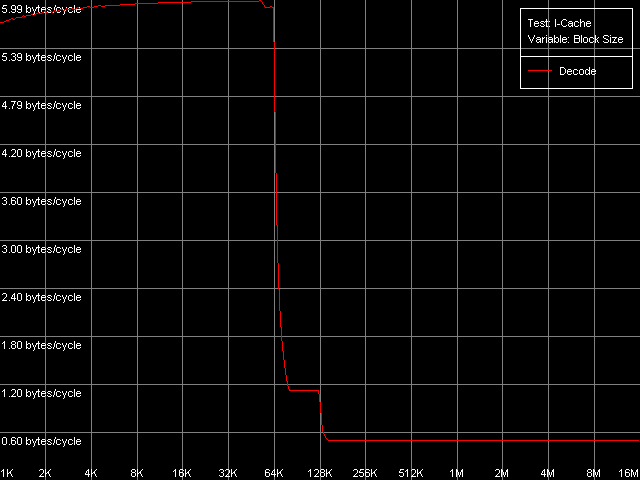 Как обычно, представим здесь наиболее показательные кривые, полученные в тесте I-Cache с использованием пресета L1i Size / Decode Bandwidth, CMP Instructions 3, в котором декодируются и исполняются простейшие 6-байтные инструкции cmp eax, 0x00000000.