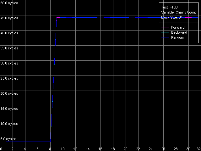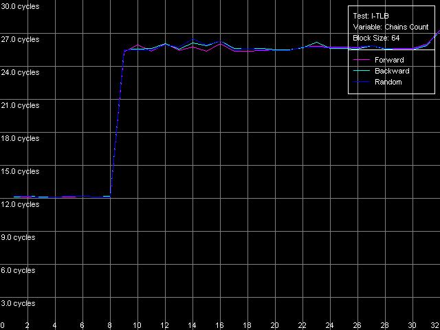 Что касается тестов ассоциативности I-TLB, здесь все так же достаточно четко. Чтобы убедиться в этом, взглянем на кривые, полученные в пресете I-TLB Associativity, 64 Entries.