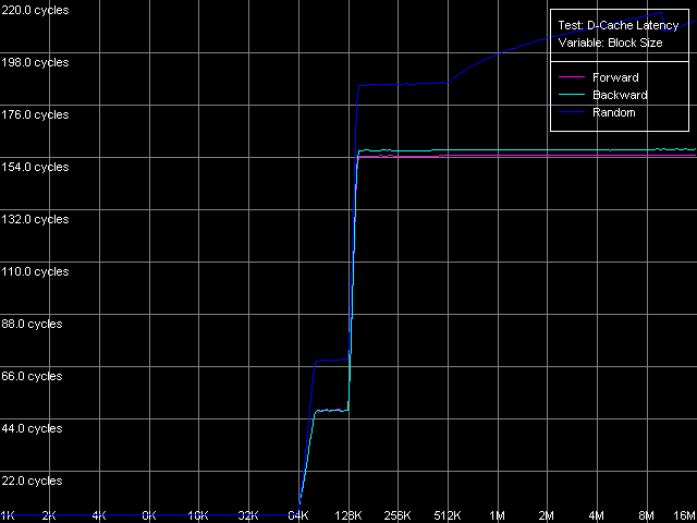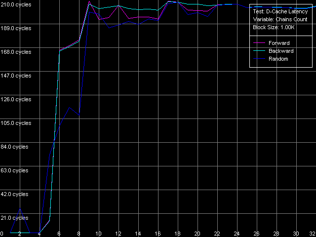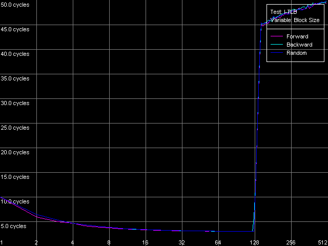 Сначала оценим качественный вид полученных кривых. По нему можно заключить, что оба процессора имеют кэш первого уровня (L1) размером 64 КБ, в то время как эффективный размер второго уровня кэша (L2) составляет 128 КБ. По данным именно этого, пока что единственного теста нельзя сказать, является ли L2 128-килобайтным инклюзивным кэшем, или же 64-килобайтным эксклюзивным. Однако представленный выше анализ документации VIA, да и результаты последующих тестов, которые мы обсудим ниже, позволяют сделать выбор в пользу второго — VIA (точнее — Centaur) пошла по пути AMD, что является вполне оправданным шагом. А вот расходовать половину объема L2 для дублирования данных L1 кэша, как это было бы, если бы правильным оказалось первое предположение (128-килобайтный инклюзивный кэш), было бы, наоборот, очень неразумной политикой.