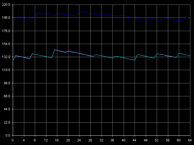 Поскольку процессоры VIA C3 имеют эксклюзивную организацию кэша, полученные в этом тесте значения реальной ПС шины L1-L2 в области 64-128 КБ необходимо удвоить, поскольку один акт обращения к L2 кэшу процессора приводит к пересылке одной строки кэша (32 байт) из L2 в L1 с одновременным сбросом строки-«жертвы» (victim) из L1 в L2.