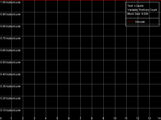 Итак, скорость исполнения инструкций вида [0x66]nNOP (в пересчете на байт/такт) не зависит от количества префиксов (n = 0-14), а это значит, что каждый префикс (в т.ч. идущие подряд одинаковые префиксы) действительно «исполняется» процессором как отдельная инструкция. Что ж, VIA/Centaur подошли к проблеме префиксов предельно просто — никаким «отсечением», столь заметным на процессорах семейства Intel Pentium 4, здесь и не пахнет.