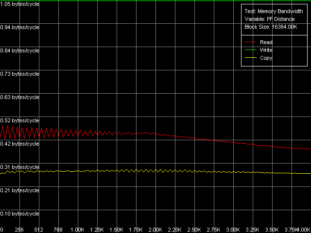 | Чтение, MMX Чтение, SSE Чтение, MMX, SW Prefetch Чтение, SSE, SW Prefetch Чтение, MMX, Block Prefetch 1 Чтение, SSE, Block Prefetch 1 Чтение, MMX, Block Prefetch 2 Чтение, SSE, Block Prefetch 2 Чтение строк кэш, прямое Чтение строк кэш, обратное | 161.6 (15.2 %) - - - - - - - 227.0 (21.3 %) 227.1 (21.3 %) | 439.0 (20.6 %) 433.4 (20.3 %) 334.1 (15.7 %) 484.7 (22.7 %) 524.1 (24.6 %) 537.3 (25.2 %) 539.3 (25.3 %) 609.0 (28.6 %) 660.4 (31.0 %) 660.3 (31.0 %) |