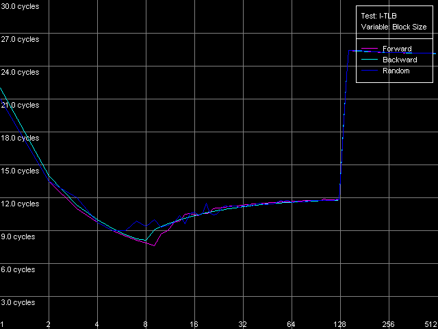 Как ни странно, тесты I-TLB никаких сюрпризов нам не преподнесли. Все выглядит вполне предсказуемо, к тому же, вскрываются некоторые дополнительные особенности реализации микроархитектуры процессоров Ezra/Antaur. Итак, для начала посмотрим на вид кривых, полученных в тесте I-TLB, пресет I-TLB Size.