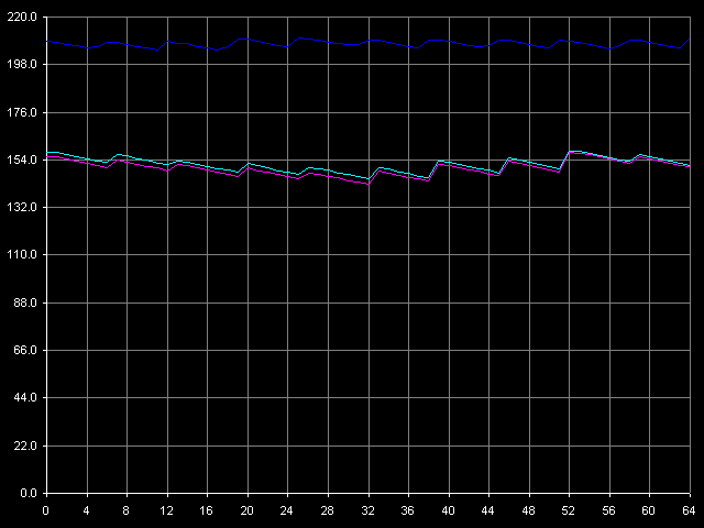 Вслед за латентностью L2, измерим минимальную латентность RAM при 4-мегабайтном размере блока, выбрав пресет Minimal RAM Latency, 4 MB Block. Представляемые графики также скорректированы с учетом погрешности измерений длительности одного «NOP»-а.