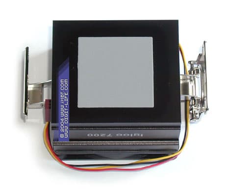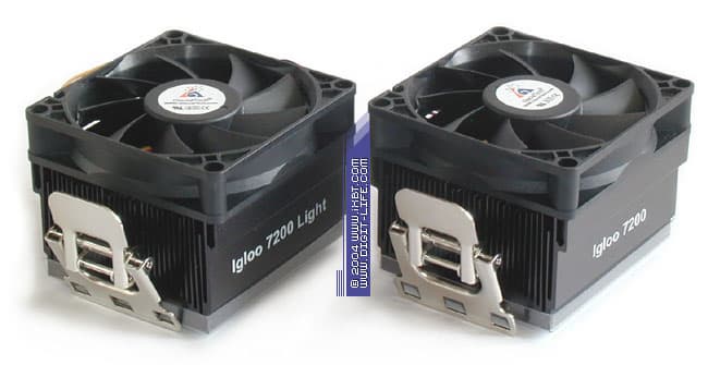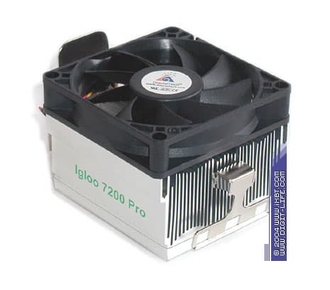Хорошее впечатление оставляет также и крепежная система этих кулеров — она отличается дружелюбной конструкцией (следует идеологии «раз, и готово!») и демонстрирует строго нормативное усилие прижима, обеспечивая быструю и аккуратную посадку радиатора в сокет. Дополнительным инсталляционным плюсом Igloo 7200 становится новая высокоэффективная термопаста (ее наполнителем является композиция оксида и нитрида алюминия), обладающая улучшенными теплофизическими характеристиками. Важность этого нюанса трудно переоценить: при тех площадях термоконтакта подошвы радиатора и процессора, что имеют место в случае с Athlon 64, вклад, вносимый термоинтерфейсом в полное термическое сопротивление кулера, может составлять десятки процентов, так что качество термопасты начинает играть здесь уже весьма существенную роль.