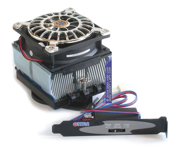 Замыкает нашу сегодняшнюю «разведгруппу» бюджетный представитель продуктовой линейки Titan — «крепыш» TTC-K8ATB/825/SC. Кулер базируется на алюминиевом радиаторе 77х82х40 мм (подошва 77х68 мм), оснащен вентилятором типоразмера 80х80х25 мм (модель Titan TFD-8025SH12C, номинальная скорость вращения крыльчатки 3800 об/мин) и укомплектован потенциометром-регулятором, позволяющим варьировать обороты вентилятора в пределах от 1800 до 3800 об/мин, а также дополнительными установочными приспособлениями.