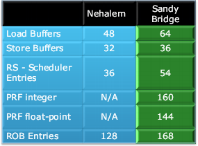 Тыл конвейера поменялся сильнее. Первое явное изменение: переход от полного буфера ROB (хранящего мопы и значения меняемых ими регистров) к комбинации сокращённого ROB (хранящего только мопы в оригинальном порядке) и двух физических регистровых файлов (PRF, хранящих содержимое переименованных регистров, на которые мопы ссылаются) — целочисленного и векторно-вещественного. Смысл перехода в том, что вместо пересылок мопов вместе с данными пересылаются только ссылки на регистры, а сами мопы и данные остаются на месте вплоть до отставки — в результате удаления ненужных пересылок экономится энергия. А за производительность отвечает вполне дежурное увеличение размеров всего разнообразия буферов и очередей.