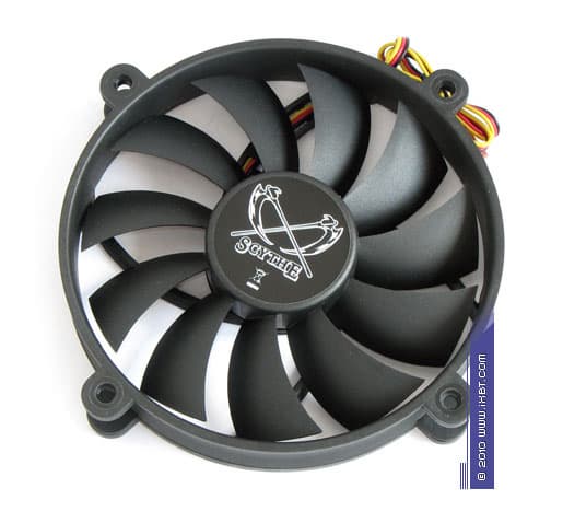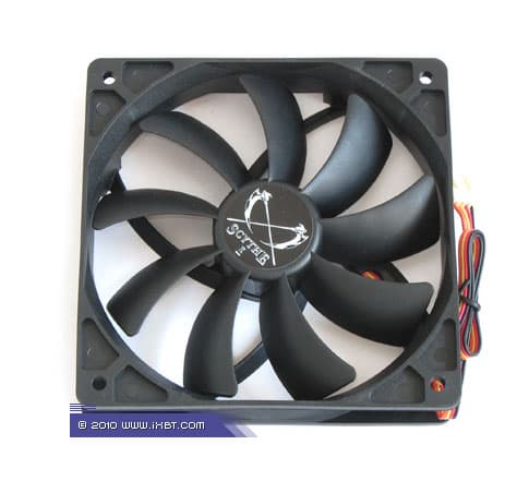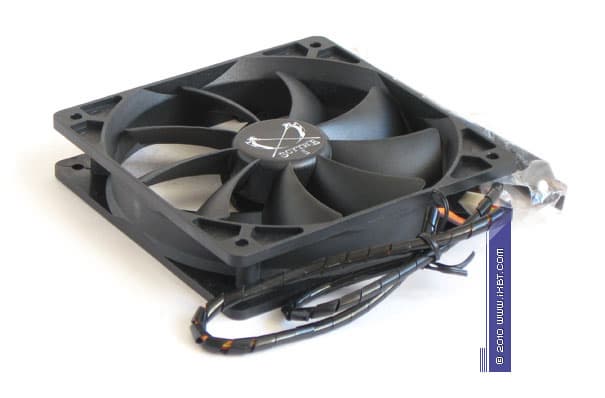 Чтобы прояснить этот момент, на радиатор подопытного кулера был установлен дополнительный высасывающий вентилятор Scythe Slip Stream (со ступенчатым изменением скорости вращения крыльчатки по отметкам 300, 500, 700, 1100 и 1900 об/мин).