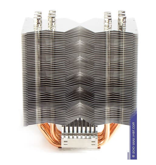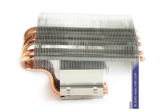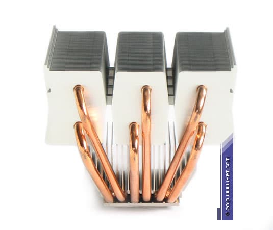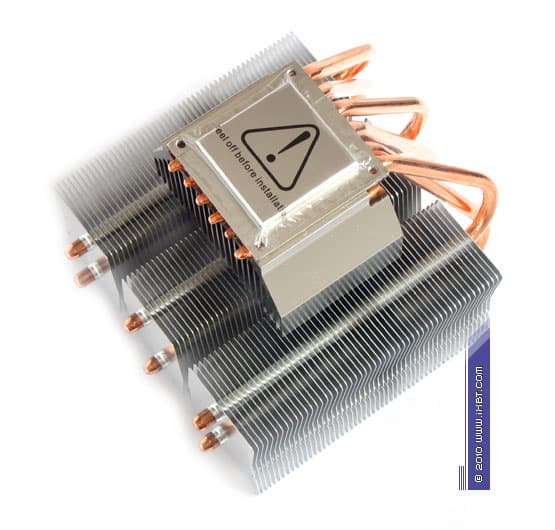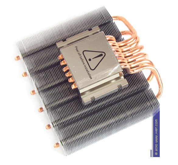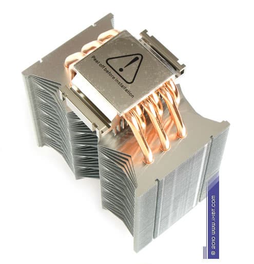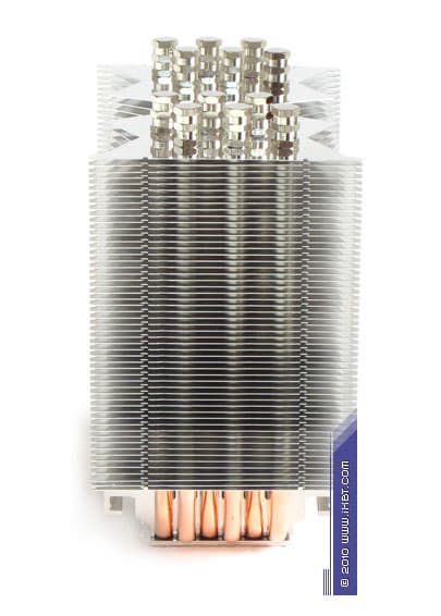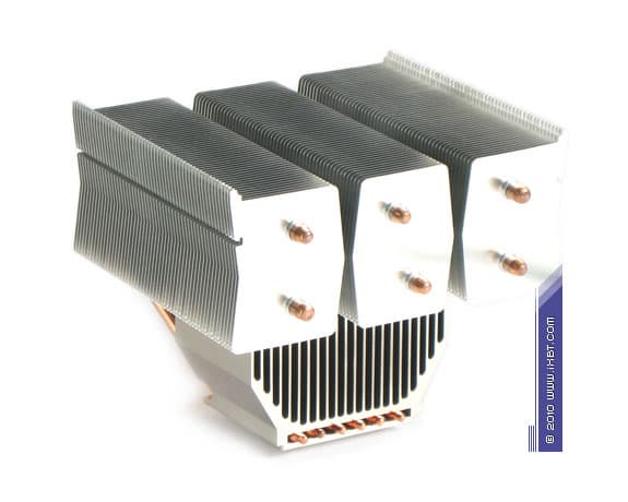 Конструктивные особенности (радиатор). «Рабочее тело» кулера образовано комбинацией медного теплосъемника 52х52х6 мм, вспомогательного алюминиевого радиатора 76х50х30 мм, шести медных тепловых трубок диаметра 6 мм и трех секций алюминиевого оребрения (53 пластины в каждой секции, общая площадь поверхности теплообмена порядка 6500 см2).