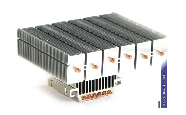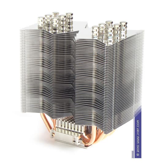 Конструктивные особенности (радиатор). «Рабочее тело» кулера образовано комбинацией медного теплосъемника 52х52х2 мм, вспомогательного алюминиевого радиатора 78х52х38 мм, шести медных тепловых трубок диаметра 6 мм и шести секций алюминиевого оребрения (68 пластин в каждой секции, общая площадь поверхности теплообмена порядка 6000 см2).