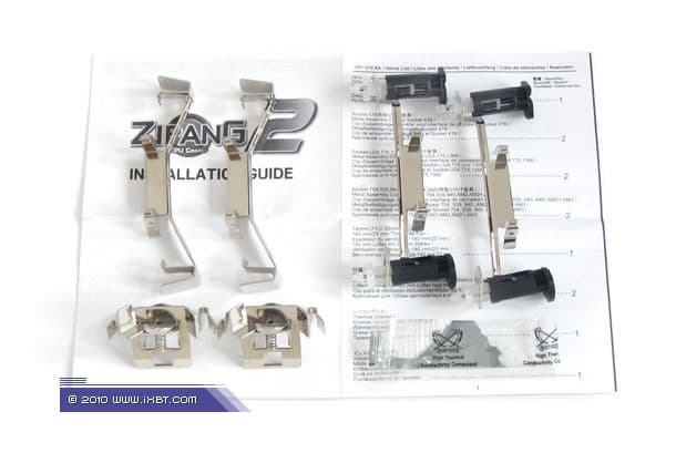 Поставка включает радиатор, вентилятор (серии Slip Stream), набор мультплатформенного крепежа (поддерживается широчайший спектр платформ — Intel Socket 478, LGA775, LGA1156 и LGA1366, плюсом сокеты AMD Socket 754/939/AM2/AM3), крепежные клипсы для вентилятора, пакетик с термопастой и техническое руководство (присутствует русскоязычная инструкция).