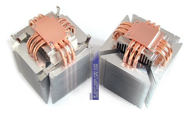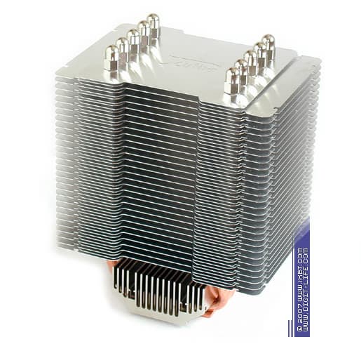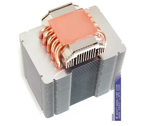 В конструктивном плане Ninja Plus Rev.B является практически доподлинной копией прародителя: здесь мы наблюдаем ту же самую «башню», которая составлена комбинацией из 6 медных тепловых трубок диаметра 6 мм и секции алюминиевых теплорассеивающих пластин толщиной 0,4 мм с характерным размером 110х110 мм в количестве 23 шт и дополнена термическим бонификатором в лице алюминиевого радиатора 65х54х25 мм (этот радиатор присовокуплен к подошве и призван разгрузить наиболее интенсивно прогреваемые участки тепловых трубок, обеспечивая более комфортные условия теплосъема в основной секции оребрения).