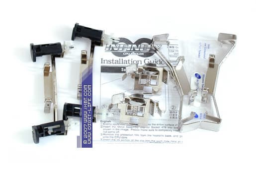 Силен Infinity также и в части эксплуатационных свойств — кулер снабжен исключительно дружелюбной крепежной системой (поддерживаются платформы Intel Socket 478, LGA775 и AMD Socket 754/939/AM2), которая обеспечивает быструю и безболезненную инсталляцию. На поверку, его можно смонтировать буквально за секунды: тут даже не понадобится отвертка — нужно только защелкнуть соответствующие установочные планки в пазах радиатора, далее зафиксировать крепеж в сокете (на платформе LGA775 — с помощью референсных замков-кембриков, в системах AMD — поворотными ручками-скобками) и инсталляция будет успешно завершена. Определенно, по эксплуатационной эргономике Infinity обставляет своего «коллегу» Ninja Plus Rev.B и в удобстве обращения, несмотря на солидный вес (около 980 г) и крупные габариты, фактически не уступает стандартным боксовым кулерам.