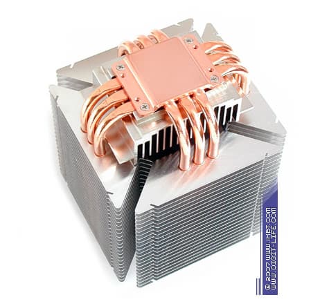 Фишкой Andy Samurai Master вновь становится индивидуализированное «трехсекционное» оформление оребрения, выполненное согласно архитектурным положениям «Infinity Interleave Fin Structure», причем даже в несколько усложненном виде — теперь центральная секция является основой радиатора и насчитывает 49 пластин (эффективные размеры 125х50 мм, толщина 0,2 мм), а два дополнительных набора пластин (16 штук, размеры 25х50 мм) размещены внутри основной секции на соответствующих линиях тепловых трубок, для термической интенсификации всех шести элементов теплосброса. Внушает почтение и площадь поверхности теплообмена, которая у нашего подопытного переваливает за 7000 см2 — то есть, по этому параметру Andy Samurai Master может легко поспорить со многими хай-эндовыми кулерами, в том числе и с идеологически родственным крепышом Big Typhoon от Thermaltake.