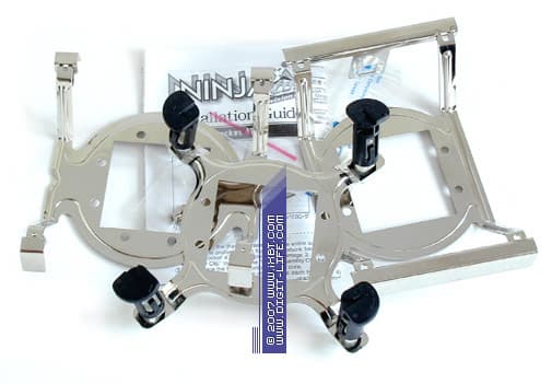 Между тем, эта доработка крепежной системы на поверку не только расширяет совместимость, но и значимо улучшает инсталляционное дружелюбие наследника серии Ninja. Теперь при установке на платформе LGA775 вытаскивать материнскую плату из корпуса не требуется, достаточно примонтировать к подошве крепежную крестовину (с помощью четырех винтов), зафиксировать радиатор стандартными референсными замками-кембриками — все, кулер инсталлирован. Не сложнее обстоит дело и в системах AMD — тут берем соответствующую установочную рамку, прикручиваем ее к подошве и далее фиксируем наш кулер ручками-скобками на двух зубцах сокета. По всей видимости, эти инсталляционные манипуляции вряд ли вызовут какие-либо затруднения даже у начинающих пользователей, не говоря уже о профессионалах-энтузиастах.