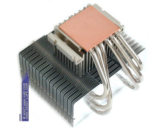 Внушительной предстает также развитая поверхность теплобмена (общая площадь составляет порядка 4500 см2), особенно с учетом того факта, что увеличенное число контактных участков оребрения с тепловыми трубками (12 элементов теплосброса), вкупе с оптимизированным размещением пластин, позволяет задействовать в полнокровный теплообмен практически всю поверхность «рабочего тела» Ninja Plus Rev.B. Ну, и опять же, нельзя не отметить хорошее качество сопряжения тепловых трубок с подошвой и оребрением их термоконтакт обеспечен добротной пайкой, что благоприятно сказывается на снижении полного термического сопротивления кулера.