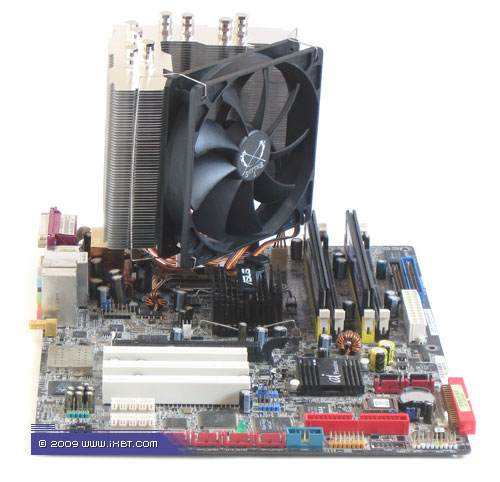 Чтобы дать ответ на этот вопрос, нами была смоделирована ситуация, отражающая функциональность популярных корпусов с «нижним» размещением БП и двумя вентиляторами «тыльным» и «верхним», которые обычно монтируются в соответствующих посадочных местах на задней и верхней стенках корпусов прямо напротив кулера. Модель формировали два вентилятора Scythe Slip Stream на скорости 300 об/мин один из них замещал «тыльный» высасывающий вентилятор (фиксировался заподлицо с внешней плоскостью IO-разъемов материнской платы), другой монтировался на расстоянии 6 см от «верхнего» края материнской платы и также был поставлен на высасывание.