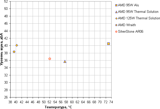 На этом графике чем ниже точка, тем тише кулер, а чем левее — тем ниже температура, поэтому самые эффективные (то есть обеспечивающие как низкую температуру процессора, так и низкий уровень шума) кулеры располагаются ближе к началу координат. Видно, что SilverStone AR06 по шумности и по способности охлаждать занимает среднюю позицию. В частности, SilverStone AR06 более эффективен, чем AMD 95W Thermal Solution и тем более чем простой кулер с монолитным алюминиевым радиатором (AMD 95W Alu на графике), но менее эффективен, чем кулеры AMD 125W Thermal Solution и AMD Wraith.