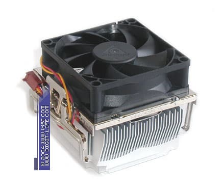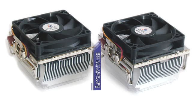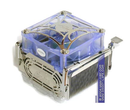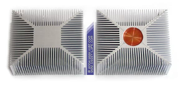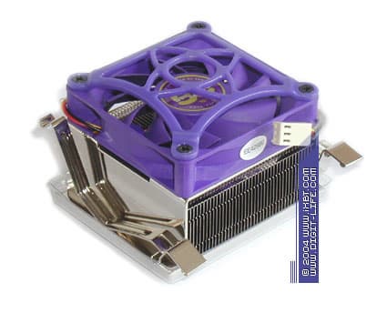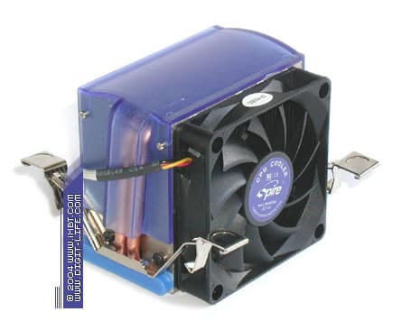 Еще один представитель нового семейства кулеров Spire для Socket 478 — CoolGate, тоже отличается неординарным конструктивным исполнением: его «рабочее тело» сдобрено двумя медными тепловыми трубками диаметра 4 мм и составлено из двух блоков — теплосъемного и теплоотдающего, роль которых играют алюминиевые радиаторы 74х45х35 мм с неплохими параметрами оребрения (толщина ребра 0,6 мм, общая площадь поверхности теплообмена около 1800 см2). А вентилятор типоразмера 70х70х15 мм (модель Fanner Tech FD07015B1H) крепится с торца всей этой комбинированной конструкции. Не лишен кулер и дополнительного внешнего лоска: подошва радиатора демонстрирует электрохимическую полировку отменного качества.