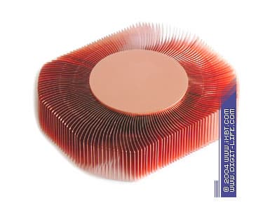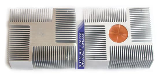 Генеральная изюминка «малыша» CoolWave — это, конечно, его высокотехнологичный радиатор оригинальной конструкции, являющий собой симбиоз медного сердечника 35х15 мм и радиального оребрения, которое образованно из 160 медных пластинок (толщиной всего 0,1 мм) и присовокуплено к сердечнику аккуратной пайкой. Здесь работают сразу две оптимизации — размерная (при весьма скромных габаритах общая площадь теплообмена составляет более 900 см2) и гидравлическая (такой радиатор отлично продувается, гарантируя сумасшедшие коэффициенты теплоотдачи на своем оребрении).