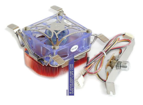 Другая новинка сезона — кулер CoolWave, также предстает весьма занимательным продуктом, как по форме, так и по содержанию. CoolWave основывается на низкопрофильном медном радиаторе 84х70х19 мм, сдобрен высокооборотистым вентилятором типоразмера 70х70х25 мм (модель Fanner Tech FD07025B1H) и укомплектован дополнительным регулятором-потенциометром, позволяющим варьировать скорость вращения крыльчатки в пределах от 2400 до 4200 об/мин.