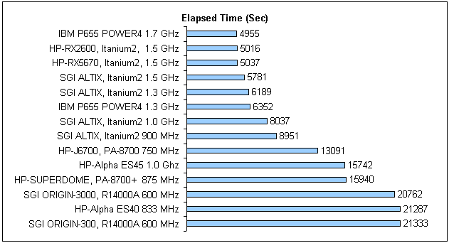Тестирование систем, в однопроцессорной конфигурации, подтвердило лидерство «топовых» 64-разрядных решений от IBM и Intel, на процессорах Power4+ и Itanium2. Хотя Itanium2 лидирует в тестах SPEC, при решении задач в рассматриваемом программном пакете, наблюдается его отставание от Power4+, здесь сказывается огромный размер кэш памяти у процессоров от IBM. Возможно, с появлением процессоров Itanium2 c увеличенным размером кэш памяти третьего уровня до девяти мегабайт ситуация изменится в его пользу. Хорошие результаты показал процессор Alpha 21364. К сожалению, после слияния HP и Compaq ожидать бурного развития линейки этих процессоров не приходится. 64-разрядные процессоры других производителей сильно отстают от лидеров. Как известно, HP и SGI давно смотрят в сторону IA64 и, похоже, решили оставить собственные разработки. Компания Sun, похоже, решила обратить свои взгляды на процессоры Opteron от AMD.