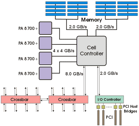 Сервер HP rx5670, построен на базе чипсета собственной разработки — zx1. В данном случае, чипсет представлен следующим набором логики: микросхема MIO (Memory and Input/Output Controller), включающая в себя контроллер процессорной шины, два контроллера памяти и контроллер ввода-вывода, две микросхемы — адаптеры расширения памяти SMA (Scalable Memory Adapter) и набор микросхем — адаптеров ввода-вывода. Блок-диаграмма чипсета zx1, в четырехпроцессорной конфигурации, представлена на рис. 5. Более подробную информацию о чипсете можно узнать по этой ссылке на сайте HP.