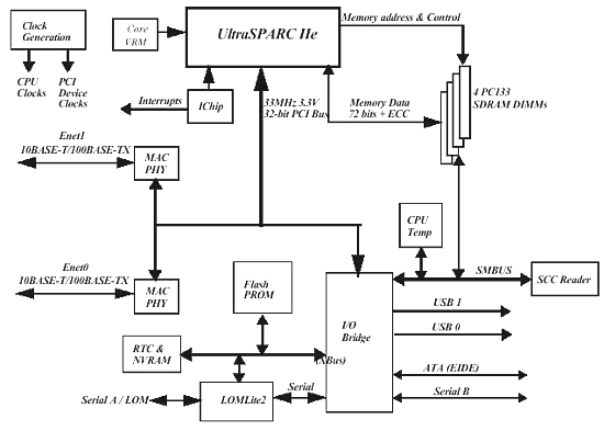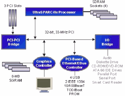 - Старомодный (но, 64 разрядный) процессор Ultra SPARC IIe (четырехканальный, суперскалярный) с частотой 450 или 500MHz и интегрированным кэшем L2 ёмкостью 256kb.