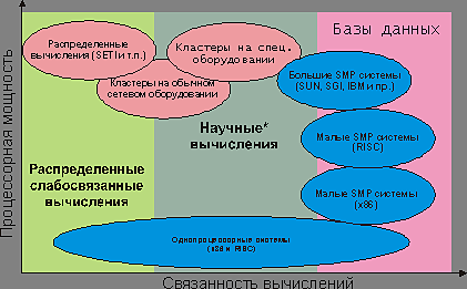 Прежде всего, хочется сказать несколько слов о различных моделях вычислений. Все существующие на рынке системы можно условно поделить на системы с общей памятью (SMP) и системы с распределенной памятью (кластеры). Опять таки условно сферы их применения можно представить следующим образом: