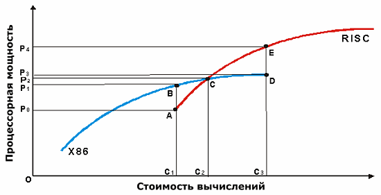 Самым интересным для рассмотрения является отрезок «CD», на этом участке значительные вложения в х86 технику («С2С3») дают уже мизерную отдачу («Р2Р3»), а вложения в RISC системы, напротив, весьма эффективны («Р2Р4»). Напротив, если требования к производительности не достигают уровня «Р2», то вполне очевидно, что переплачивать за RISC системы не стоит. Но, если в процессе развития требования к производительности превысят уровень «Р2», то перед владельцем системы будет два пути — первый: до конца, не считаясь с эффективностью вложений поддерживать унаследованную х86 систему (до точки «D», суммарные расходы «ОС3») или второй: идти на замену системы на высокопроизводительное RISC решение. Затраты при этом (суммарные) составят «ОС2»+«ОС3». Что очень много. Напомню, шкала логарифмическая… Впрочем, если требования к производительности превысят уровень «Р3», то выбора у владельцев системы уже не будет (предполагается, естественно, что адекватность системы требованиям критически важна для бизнеса). Систему придется менять.