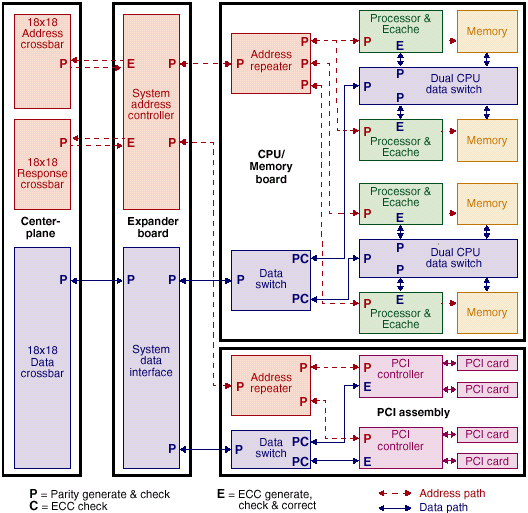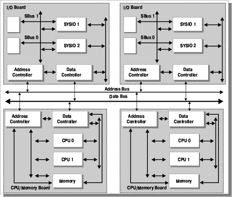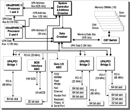 В качестве примера младших серверов SUN можно предложить читателю рассмотреть внимательно архитектуру сервера SUN Ultra Enterprise 170E или Ultra Enterprise 2 (машинки довольно старомодные, но интересующие нас особенности на их примере можно рассмотреть подробно). Главное, на что хотелось бы обратить внимание читателя — это ширина шин данных портов UPA, которыми процессоры присоединяются к системе (128 разрядов + ECC) и ширина шины памяти (256 или 512 бит + ECC). Такая организация в совокупности с индивидуальными каналами адресации и весьма продвинутой системой управления памяти с малыми задержками и большой шириной ШД (шины данных) позволяет организовать бесперебойное снабжение процессоров данными и обеспечение достаточной полосы пропускания для работы устройств ввода/вывода.