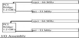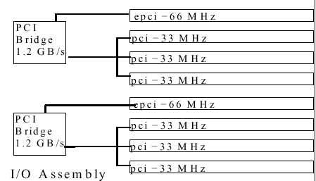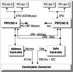 2. Самым интересным в этой структуре являются шины ввода-вывода. Обратите внимание, 6(!) шин PCI (правда, всего 5 независимых — PCI-B подключена через PCI-A), причем пропускной способности задействованных портов UPA более чем достаточно для обеспечения одновременной работы всех шин ввода/вывода на максимальной скорости. Что, как несложно подсчитать, много больше, чем может обеспечить даже самая «навороченная» Intel-based система.
