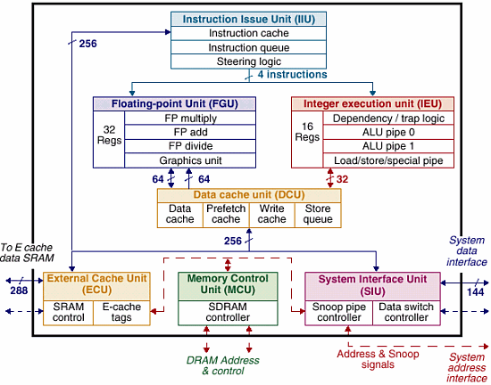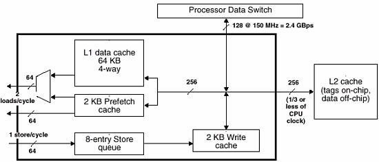 В частности, размер интегрированных на кристалл кэшей L2 (L1 в фирменной терминологии, кроме того процессор имеет 16kb кэш первого (нулевого) уровня) составляет 256Кб (D128+I128), таким образом off chip кэши (составляющие, как и у машин SUN до 8 Mb) становятся кэшами третьего уровня.