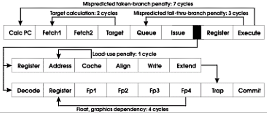 Конвейер этого процессора имеет длину 14 стадий, что является рекордной длиной для промышленных RISC процессоров (я помню про 20 + декодирование у P4, просто я веду речь о серверных процессорах, а на этом фронте Р4, так сказать, «не преуспел» :-)). Новейшие разработки на базе Р4 несмотря на все архитектурные «навороты» демонстрируют прирост производительности мягко говоря не очень адекватный приросту паспортных величин (частоты ядра, пропускной способности шин, введению громадного L4). Я склонен «списать» этот некоторый «пролет» именно на архитектурные особенности ядра процессора.