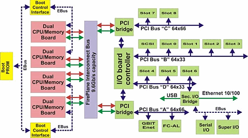 Кроме того, в отличие от SUN, Fujitsu-Siemens не сажает более 2 плат по 4 процессора на один канал системной шины, в то время, как SUN в серверах 6800 допускает до 24 процессоров (6 плат) на одной шине FirePlane.
