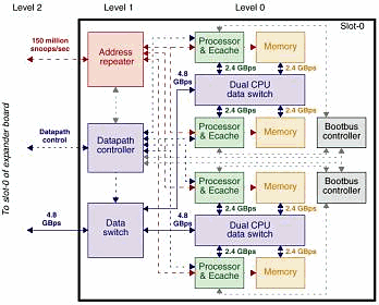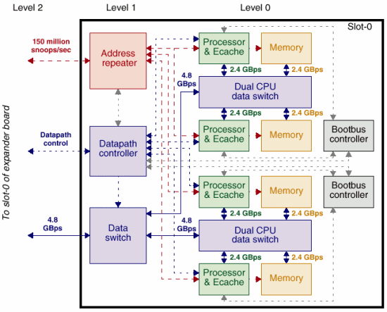 В системе, построенной в соответствии с концепцией Ultra Port применяются, в основном, соединения «точка-точка». Но, поскольку, число портов UPA в системе не ограничено только теоретически (на самом деле, очевидно, что создать чип, например, с 144*64=9216(!) «ногами» только для шин данных, мягко говоря, очень сложно (если не сказать — невозможно), поэтому в более чем 4 процессорных системах SUN применяется многоуровневая коммутация (коммутация четырехпроцессорных модулей через порт UPA). Такая архитектура позволяет строить максимально однородные системы в диапазоне 1-512 процессоров и обеспечивать высокие показатели в части отказоустойчивости и удобства эксплуатации систем.