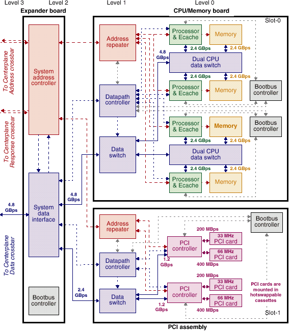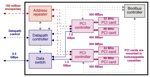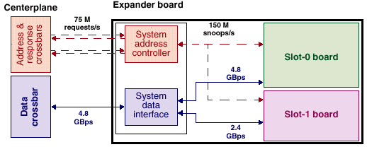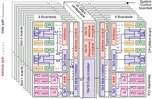 Свою роль сыграло и то, что пропускная способность применяемой системной шины несильно уступает пропускной способности шины FirePlane и значительно превосходит таковую у GigaPlane — эта шина имеет ширину 256 разрядов (против 512 у FirePlane) и частоту 225MHz против 150. Соответственно, ее пропускная способность составляет 7200 Mb/s на канал, что для архитектуры серверов серии 2000, весьма похожих на Enterprise 10000 дает (128 процессоров в 32 четырехпроцессорных платах) дает совокупную пропускную способность несколько даже превосходящую таковую у SUN Fire 15k.