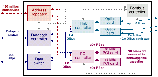 Внутренняя организация Gigaplane-XB интересна тем, что она содержит четыре адресных коммутатора. Число их соответствует числу модулей памяти на системных платах, и каждый модуль обычно выводится (коммутируется) на отдельную шину адреса. Таким образом может быть осуществлена одновременная адресация (но не передача данных!) ко всем модулям памяти платы. Большое число шин адреса необходимо для обеспечения высокой пропускной способности коммутатора данных. При меньшем их количестве коммутатор данных будет простаивать.