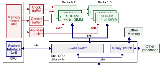 Пропускная способность шины данных порта UPA — 83,3MHz*16byte=1.333Gb/s, а памяти (общей для обоих процессоров и шины ввода/вывода, обратите внимание(!) 83,3MHz*16byte=2.6Gb/s или 5,2Gb/s. Т.о., как сказано выше пропускная способность памяти этих систем достаточна (и, даже, несколько избыточна) для нормальной работы двух процессоров и систем ввода/вывода с максимально возможной скоростью.