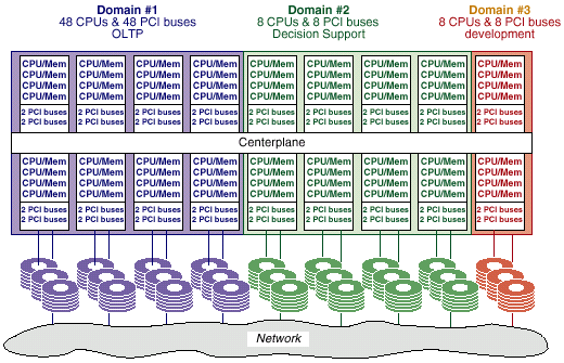 В качестве доменов может выступать от одной до нескольких системных плат. Домен является полноценным SMP-компьютером, на котором можно производить все необходимые вычисления и пользоваться общесистемными ресурсами (дисками и т.п.).